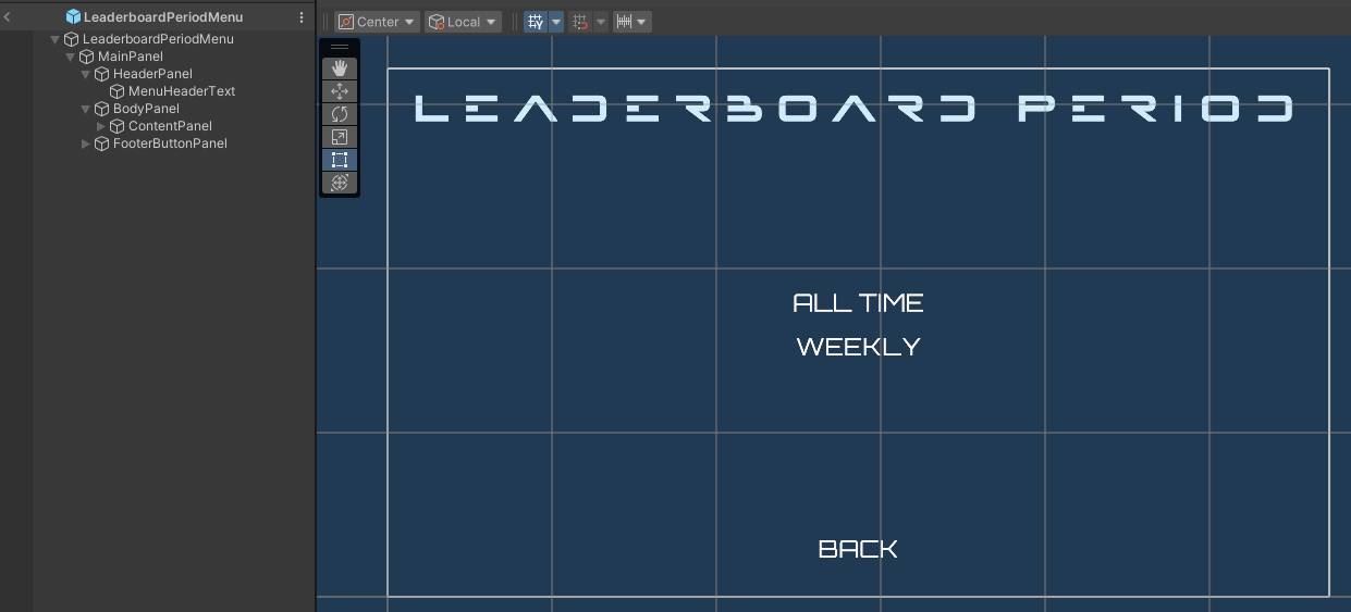 Below is a preview of the LeaderboardPeriodMenu prefab. This menu displays buttons to select the leaderboard time period. There are two types of leaderboard time periods: All-Time and Cycle. In this tutorial, we will implement the Weekly leaderboard period.